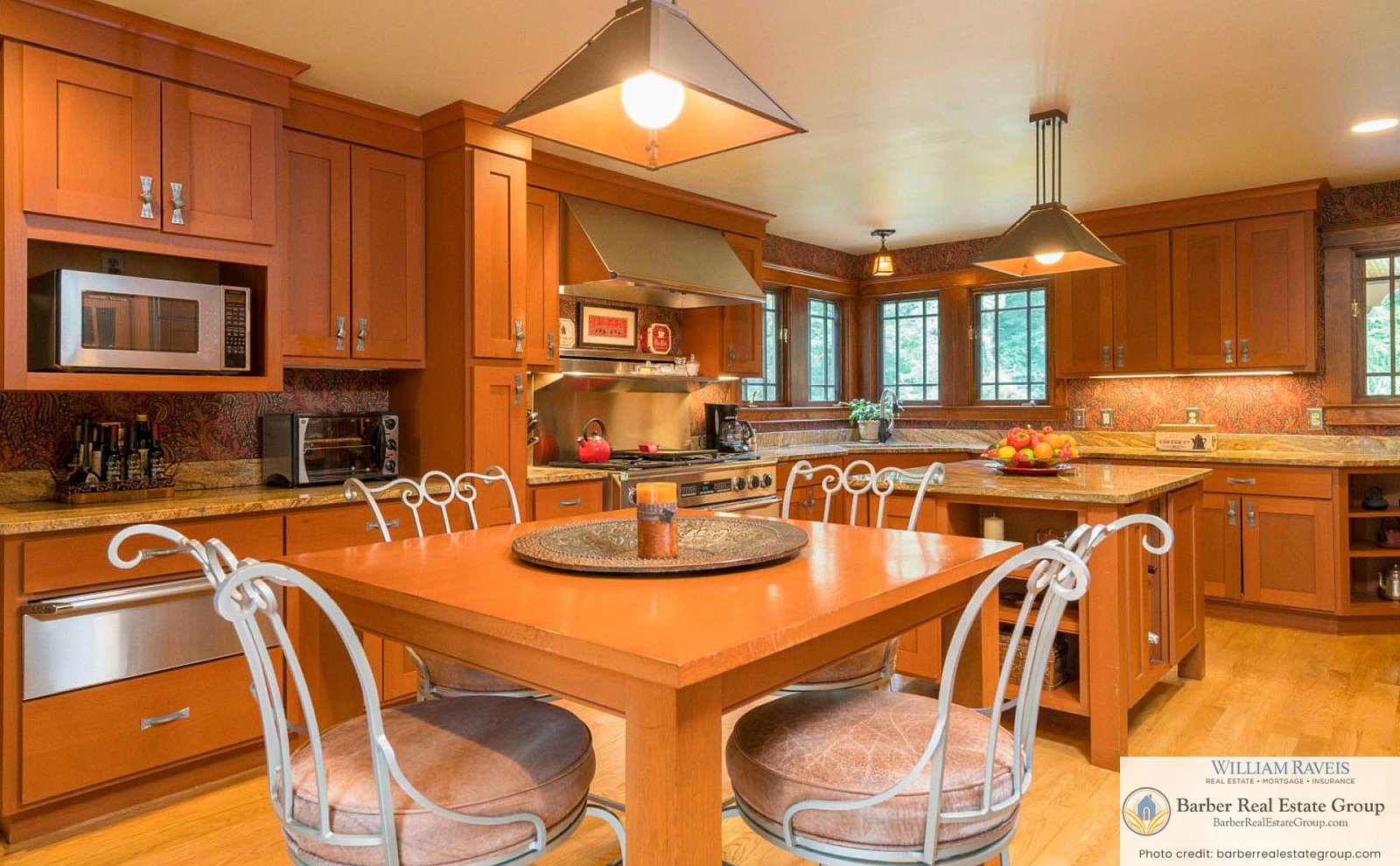 This homage is most evident in the living room, where a stately river stone fireplace and Craftsman-style wood wainscoting take center stage. The same meticulous attention to detail continues throughout the home, especially in the kitchen and dining room, where rich woodworking and period-inspired wallpaper add warmth and authenticity.